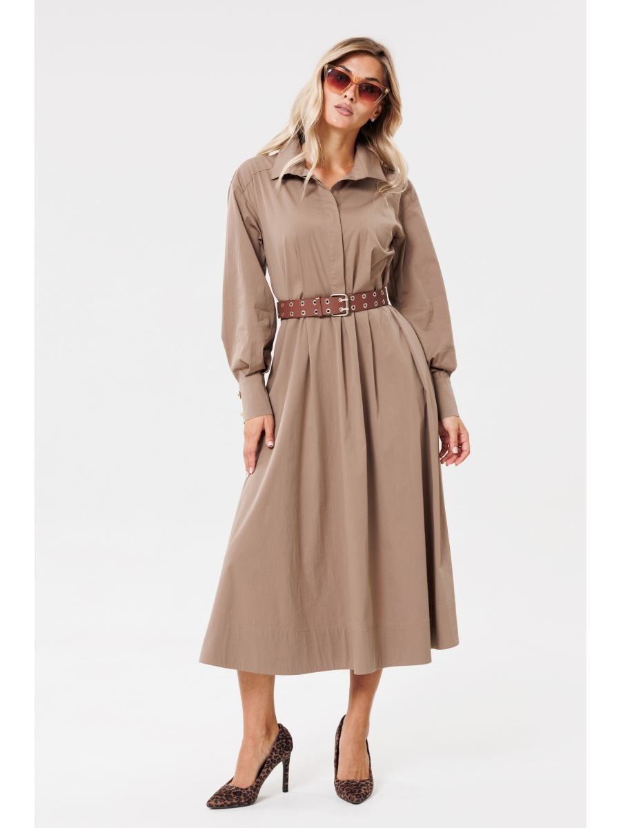 Платье женское из текстильной ткани, отрезное по линии талии, расширенное к низу. По юбке спереди и сзади заложены складки. В боковых швах расположены карманы. По центру лифа есть потайная застежка на петлях-пуговицах. Верхняя часть спинки с кокеткой. Рукав одношовный, низ рукава обработан манжетой на петлях-пуговицах. В платье спущенное плечо. Вырез горловины обработан воротником со стойкой. Платье свободное. Низ платья обработан широкой обтачкой с закрытым швом.