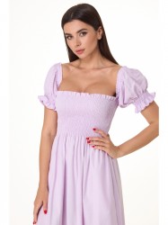 Платье длины миди, с прилегающим лифом, полностью собранным на нитку-резинку, прекрасно сядет на любую фигуру, низ платья свободный, не сковывает движений.