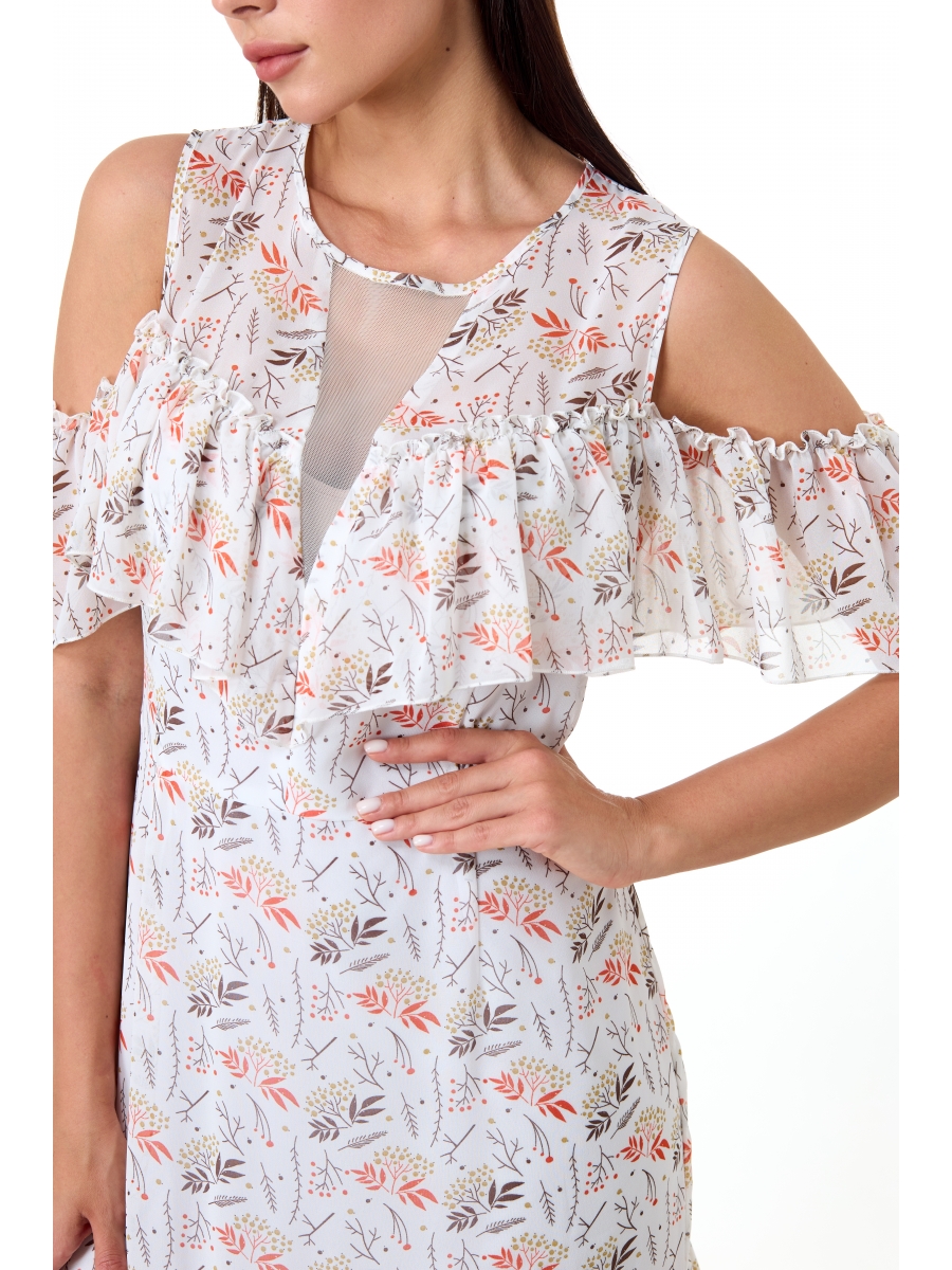 Элегантный полуприлегающий силуэт, отрезное по линии талии, с округлым вырезом горловины и прозрачной вставкой. По шву притачивания кокеток переда и спинки-широкий, переходящий по рукам, волан, закреплённый по плечевым швам. Низ платья с притачными воланами.