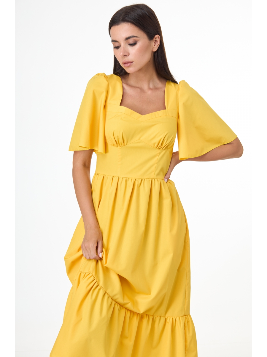 Платье длины миди, полуприлегающего силуэта, отрезное по линии талии.