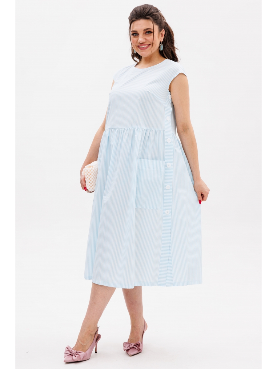 Отрезной крой по талии деликатно подчеркивает силуэт, а декоративные петли с пуговицами по бокам придают платью изящную деталь, делая его интереснее. Воздушная миди-длина удобна для прогулок и отдыха, а натуральная ткань позволяет коже дышать даже в самый теплый день.