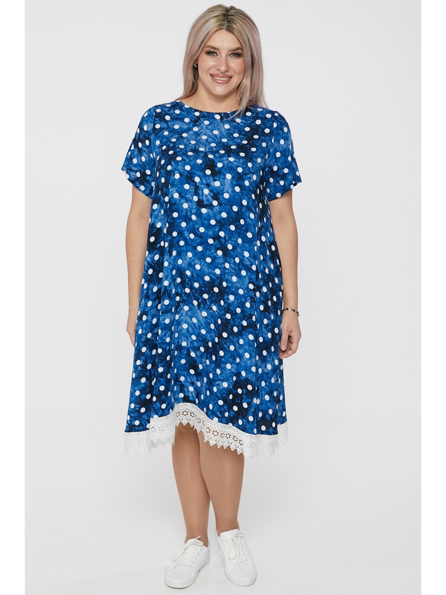Платье трапециевидного силуэта, длиной ниже колена. Выполнено из дышащей хлопковой ткани с ярким принтом. Модель имеет простой круглый вырез горловины и короткие втачные рукава. Низ асимметричный, декорирован кружевом. Замечательный выбор для комфортных прогулок.