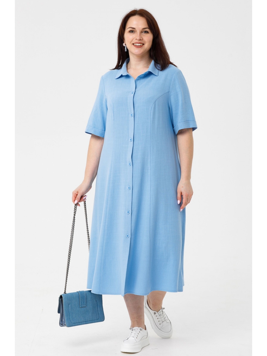 Платье полуприлегающего силуэта из льняной ткани. По спинке и переду вертикальные рельефы. Горловина оформлена отложным воротником на притачной стойке. По переду планка по всей длине изделия, с застежкой на петли и пуговицы. Втачной укороченный рукав по низу дополнен цельнокроенной манжетой. Низ прямой. В боковых швах удобные карманы.