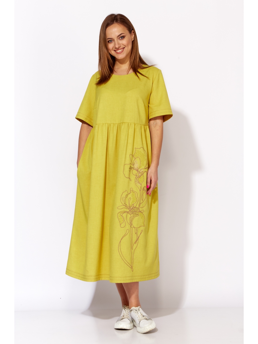 Платье расширенное к низу. Рукав втачной , короткий. Вырез горловины круглой формы. Лиф платья отрезной выше линии талии. Нижняя часть платья со сборкой. Карманы в боковых швах. Перед задекорирован вышивкой шнуром и пайетками. Застежка сзади, до линии подреза, на отрезную планку с петлями и пуговицами.