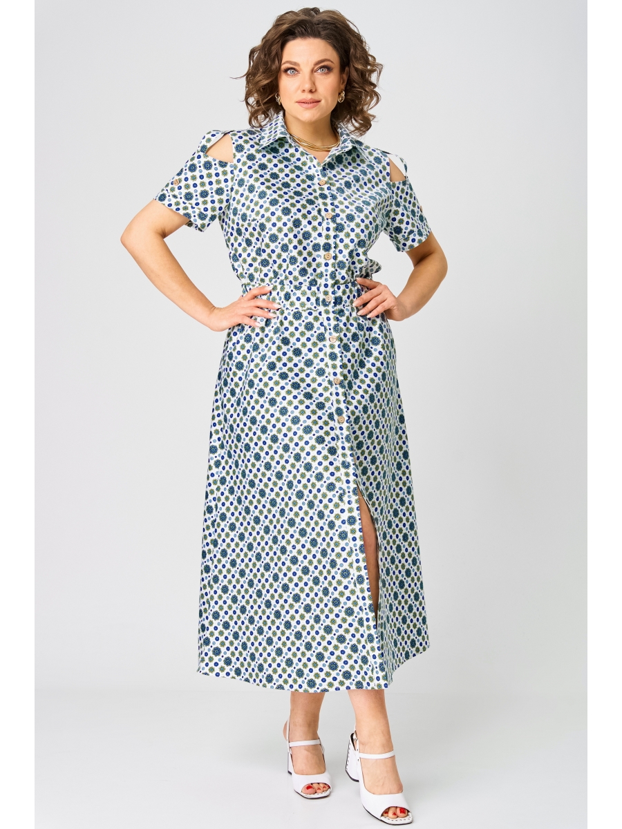 Платье полуприлегающего силуэта, расклешенное книзу. Воротник отложной, на притачной стойке. Платье отрезное по линии талии, на широкой резинке. Платье с центральной застежкой на петли и пуговицы на притачных планках. Полочка с нагрудными вытачками. В боковых швах юбки функциональные карманы. Рукав втачной короткий, с открытым плечом и декоративной патой на пуговице, понизу - притачная манжета.