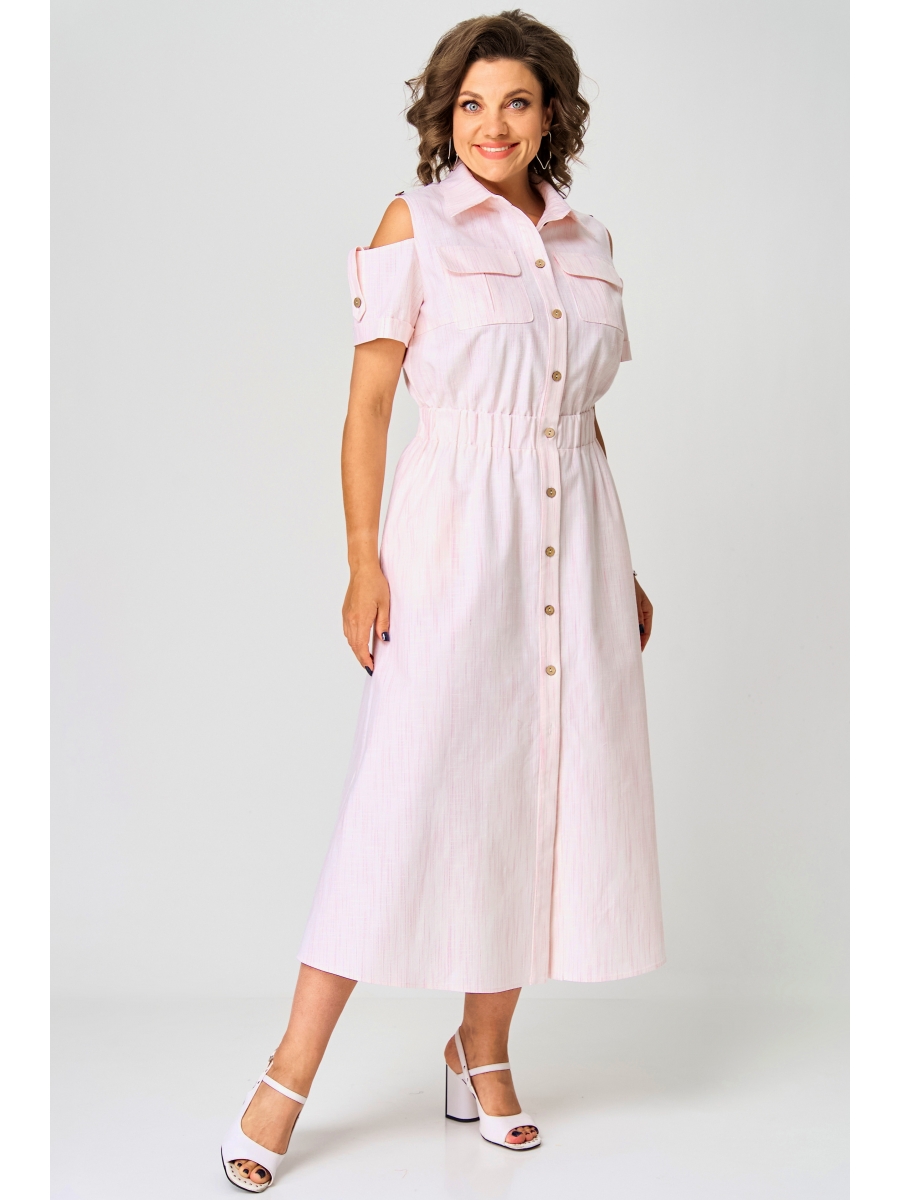 Платье полуприлегающего силуэта, расклешенное книзу. Воротник отложной, на притачной стойке. Платье отрезное по линии талии, на широкой резинке. Платье с центральной застежкой на петли и пуговицы на притачных планках. Полочка с нагрудными вытачками и накладными карманами со складкой и клапаном. В боковых швах юбки функциональные карманы. Рукав втачной короткий, с открытым плечом, понизу - притачная манжета и декоративная пата на пуговице.