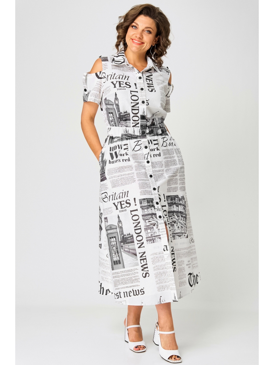 Платье полуприлегающего силуэта, расклешенное книзу. Воротник отложной, на притачной стойке. Платье отрезное по линии талии, на широкой резинке. Платье с центральной застежкой на кнопки на притачных планках. Полочка с нагрудными вытачками. В боковых швах юбки функциональные карманы. Рукав втачной короткий, с открытым плечом, понизу — притачная манжета и декоративная пата на пуговице.