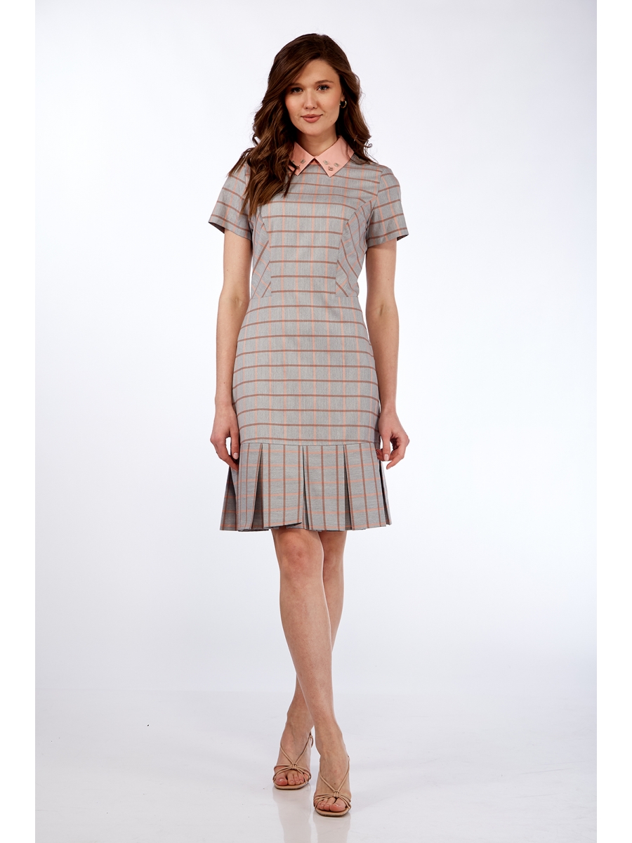 Платье женское, прилегающего силуэта, из текстильного материала. Вырез горловины обработан рубашечным воротником с отрезной стойкой. Перед и спинка платья с рельефными швами, идущими от пройм и переходящими по талии в боковые швы. Потайная застежка на тесьму - "молнию" в среднем шве спинки. Нижняя часть платья со встречнми складками. Рукава втачные, одношовные, короткие.