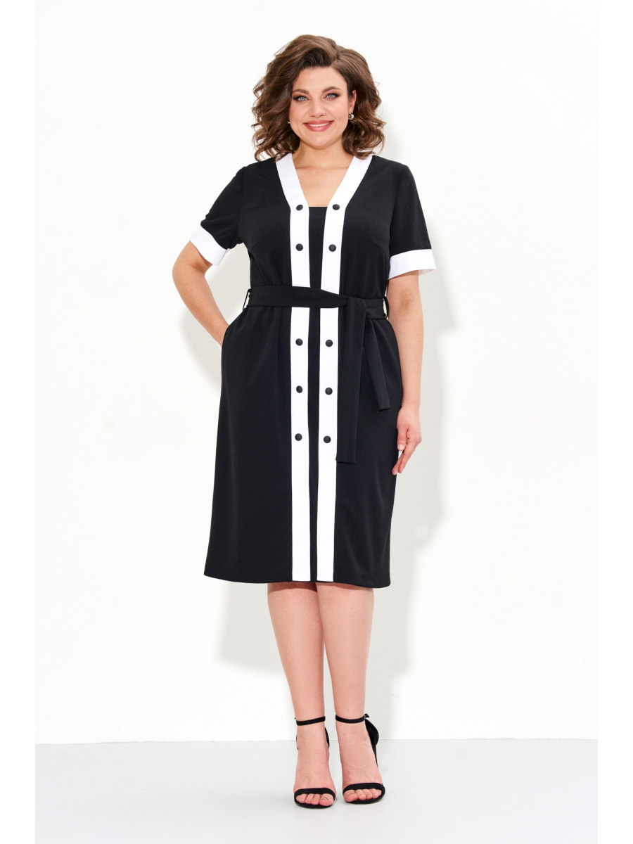 Платье женское A-силуэта в стиле "шанель" без подкладки со втачными рукавами и V-образным вырезом горловины. По переду "маленького черного платья" декоративная планка из той же ткани белого цвета и функциональные карманы в боковых швах. В комплекте съемный пояс.