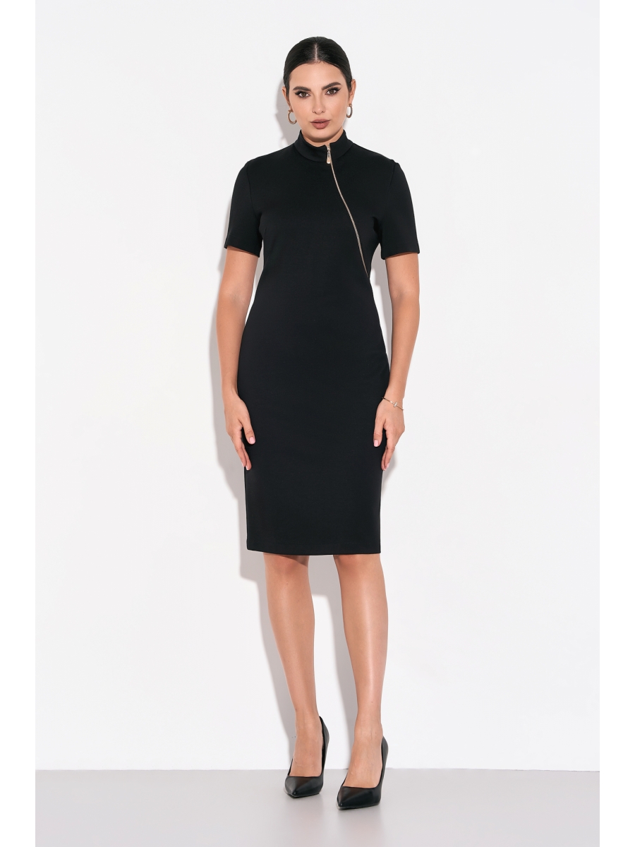 Женское классическое черное платье полуприлегающего силуэта со втачными рукавами из мягкого высококачественного трикотажа с содержанием вискозы. По переду изделия функциональная молния, переходящая в воротник-стойку, по спинке - вытачки и разрез. При правильном уходе ткань не скатывается и не деформируется.