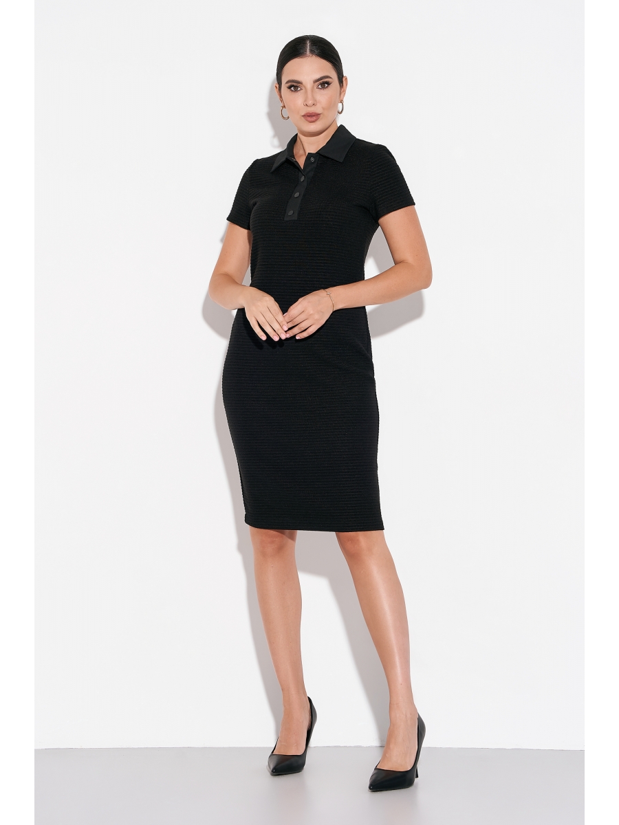 Классическое женское платье-поло полуприлегающего силуэта со втачными рукавами, с отложным воротником и застежкой-планкой на кнопки. Изделие выполнено из мягкого высококачественного трикотажа с содержанием вискозы, воротник и планка - из джинсовой ткани. При правильном уходе ткань не скатывается и не усаживается.