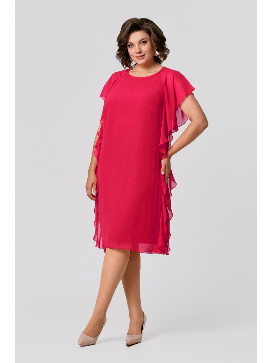 Платье женское прямого силуэта из легкой шифоновой ткани на подкладке из трикотажного полотна с антистатическим эффектом; рукава реглан, переходящие в декоративные воланы по переду и спинке. Рекомендована стирка при t не выше 30 С, глажение при t прессующей поверхности не выше 110 С.
