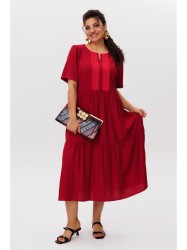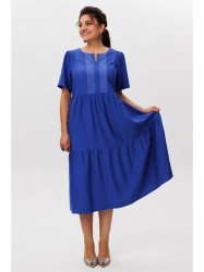 Воздушный силуэт, струящийся по фигуре, мягко подчеркивает линии, даря свободу и легкость. V-образный вырез в обрамлении округлой горловины добавляет изящный акцент, а игра воланов оживляет каждый шаг. Короткие рукава и удобные карманы вписаны так естественно, что кажутся частью образа, а не просто деталью. И завершающий штрих — нежное кружево, придающее наряду тонкую романтичность.