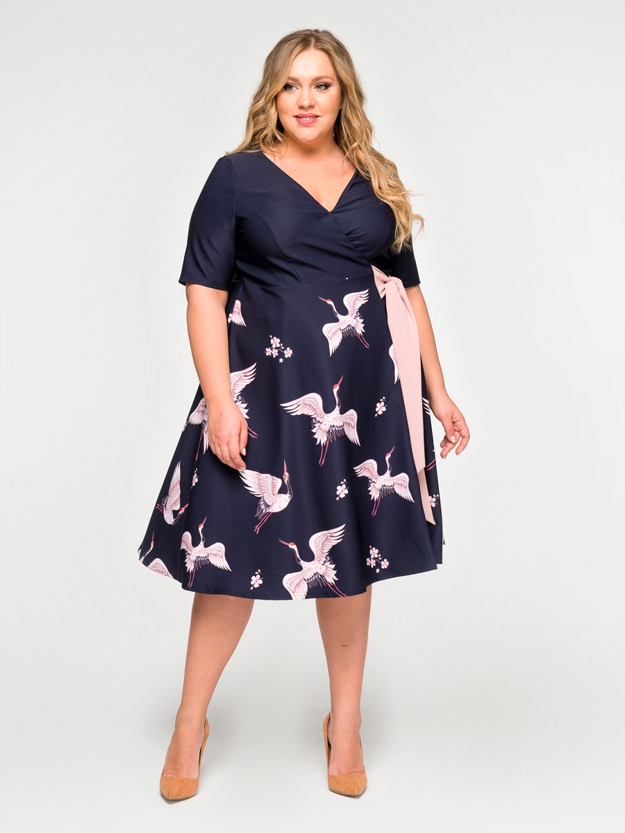 • Название: Платье с запахом из крепа, принт "журавли", пояс сомон