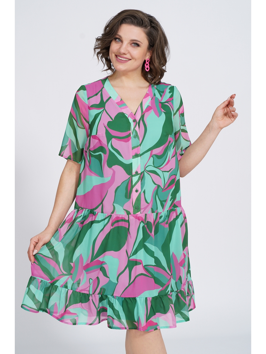 Платье женское силуэта А-образной формы, на подкладке, ниже линии талии, понизу с двумя притачными оборками разной ширины по шву соединения собраны на сборку. С застёжкой по притачной планке на петли и пуговицы. Перед с нагруными выточками. Рукава втачные, одношовные, короткие.