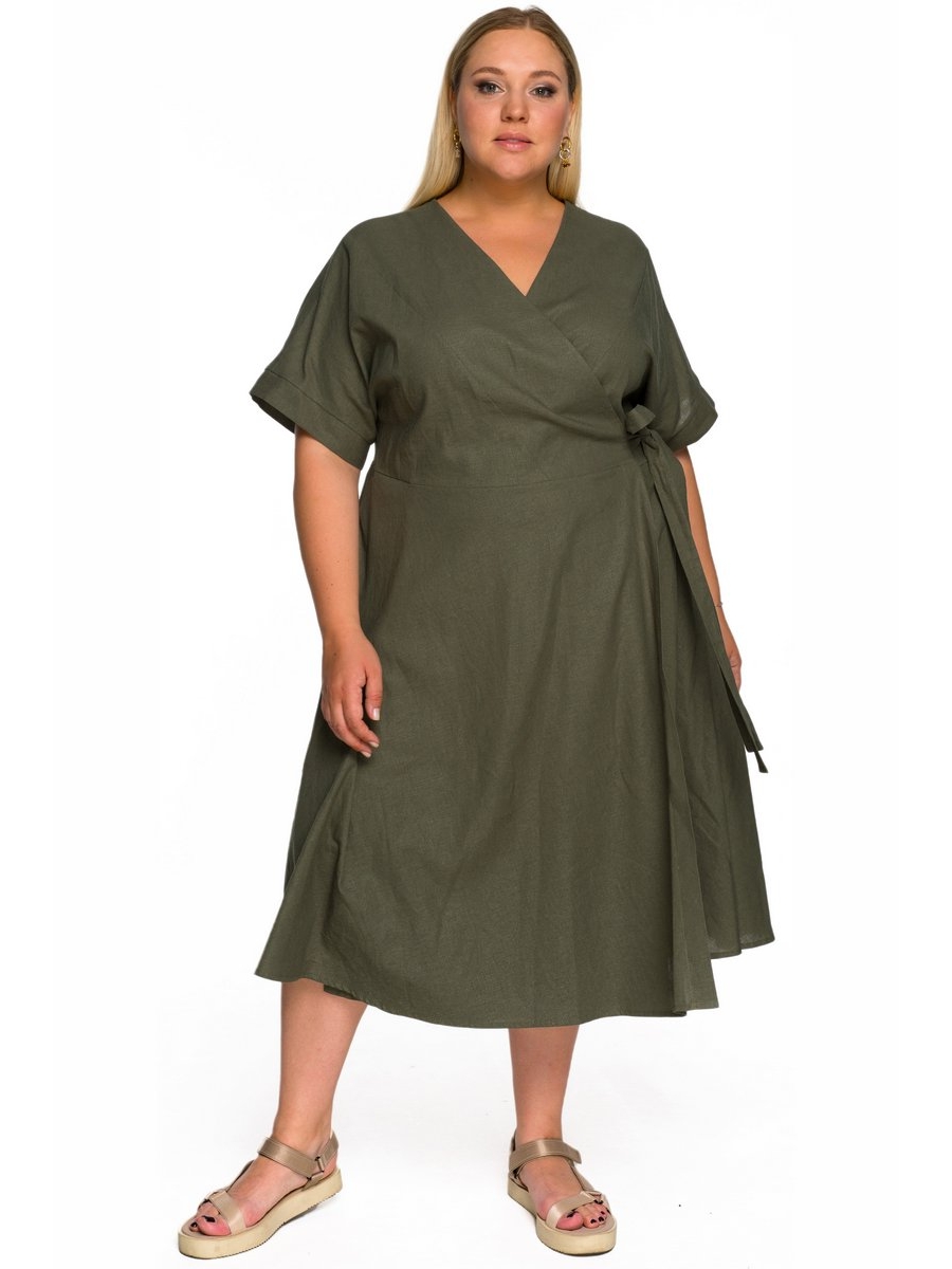 Классическое городское платье с запахом из льна, отрезное по линии талии. Линия плеча спущена и заканчивается планочкой.