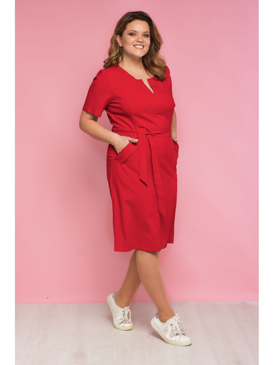 Платье. Перед с рельефными швами, выходящими из проймы и переходящие в отрезной бочок, спинка с рельефными швами. Горловина оформлена вырезом на декольте. Два рабочих кармана по бокам платья.