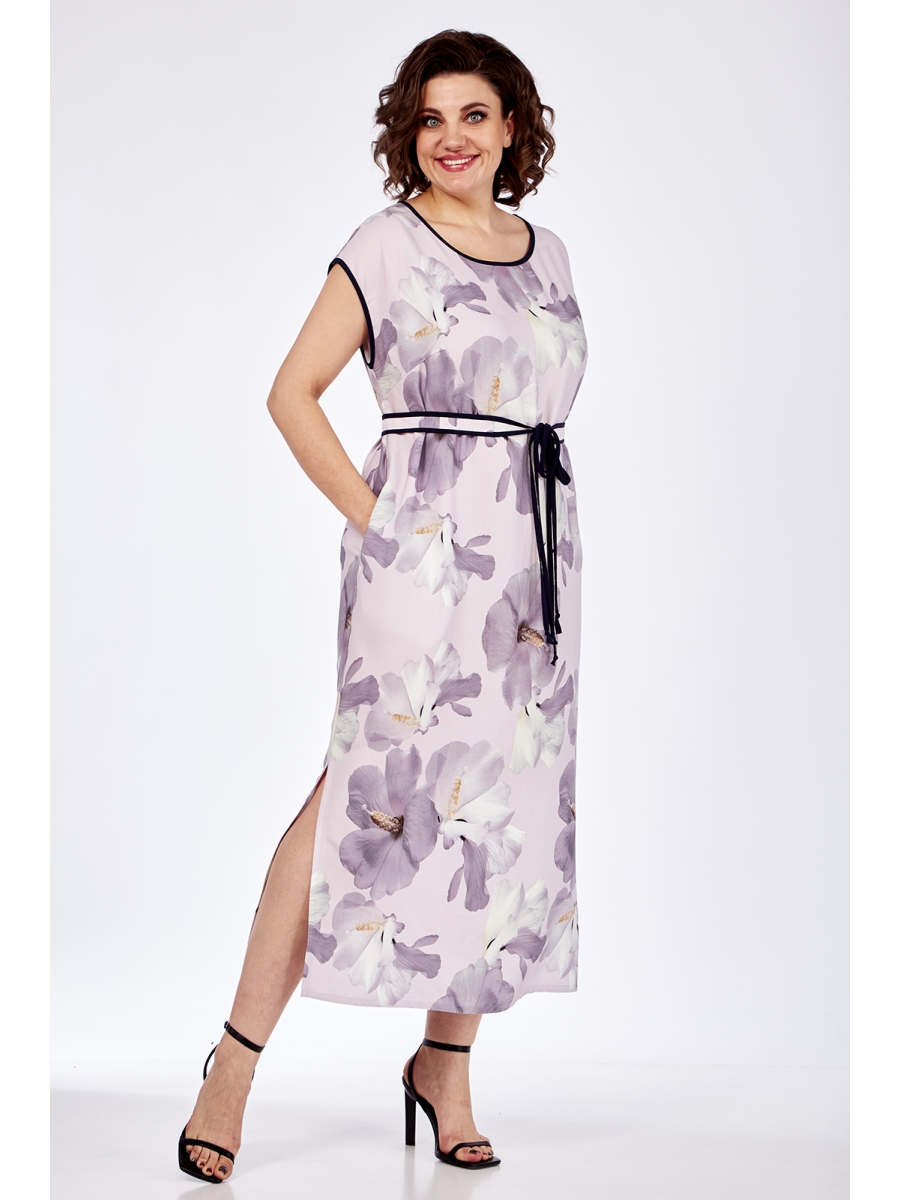 Платье женское прямого силуэта, изготовлено из плательной ткани. Горловина круглой формы, рукав спущенный с контрастной окантовкой. По переду нагрудные вытачки. В боковых швах обработаны карманы и разрезы внизу. Платье дополнено декоративным съемным поясом.