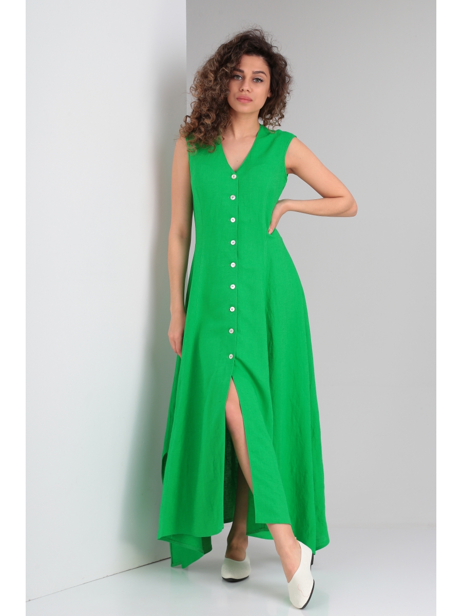 Платье расклешенное от линии талии с фигурным низом и разрезами в боковых швах, Выполнено из трикотажного полотна, по спинке глубокий декоративный вырез, застежка на пуговицы.