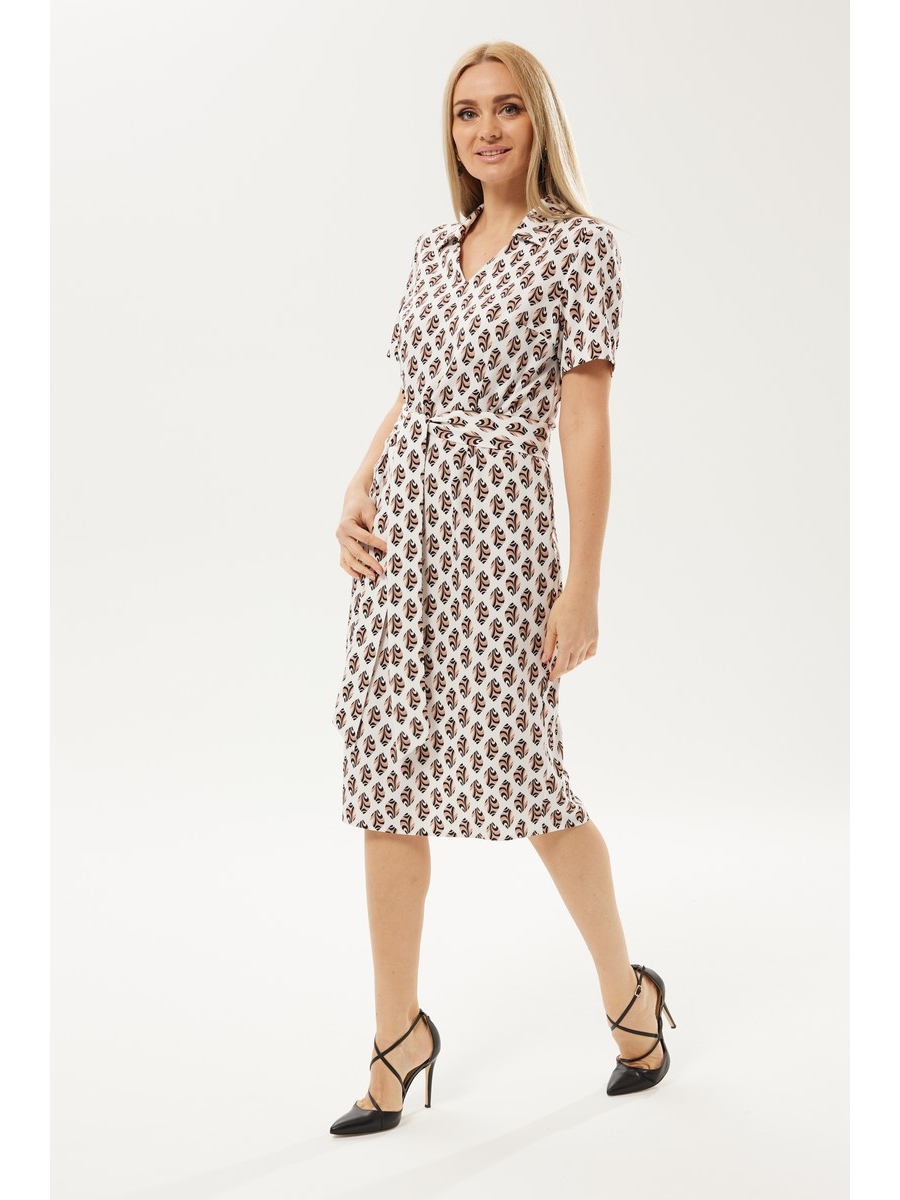 Платье длиной по колено полуприлегающего силуэта. Перед с нагрудными вытачками и V-образным вырезом. Спинка со средним швом, в котором расположена шлица. Горловина оформлена отложным воротником на полустойке. На полочке и спинке талиевые вытачки для прилегания. В боковом шве расположена потайная тесьма-молния. Рукав втачной короткий.