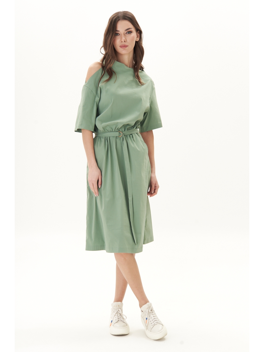 Свободный А-образный силуэт, рубашечный покрой, ассиметричная горловина, изысканный открытый участок плеча, эластичная тесьма по линии талии, съёмный пояс на полукольцах.