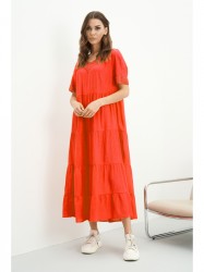 Платье с V-образным вырезом горловины, отрезное чуть выше линии талии, с коротким рукавом покроя-реглан имеет конструктивное решение в виде широких воланов с легкими сборками.
