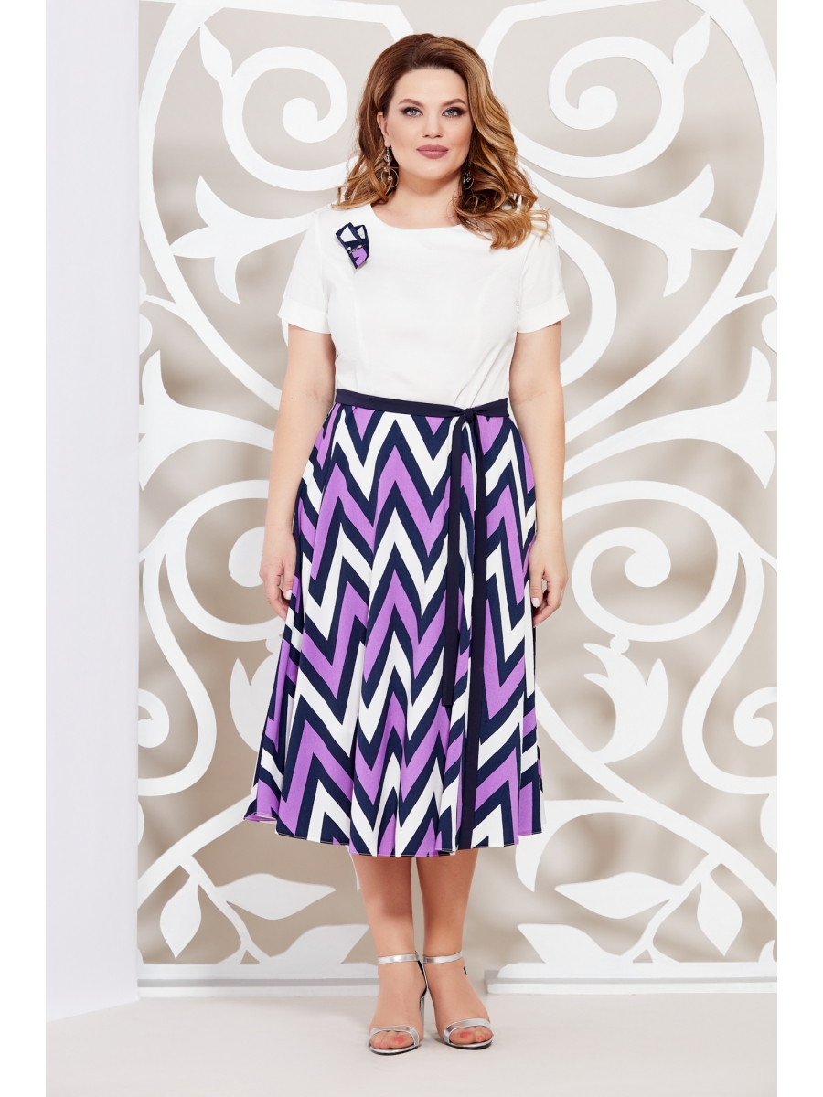 Летнее, отрезное по линии талии платье с расширенной к низу юбкой. Лиф платья выполнен из эластичной хлопковой ткани, юбка платья из плательной ткани на подкладке из хлопка. Платье с коротким втачным рукавом и отложной манжетой. По лифу переда платья рельефы, по спинке талиевые вытачки и средний шов. Лиф платья украшен брошью ручной работы. По талии платья пояс из отделочной ткани.