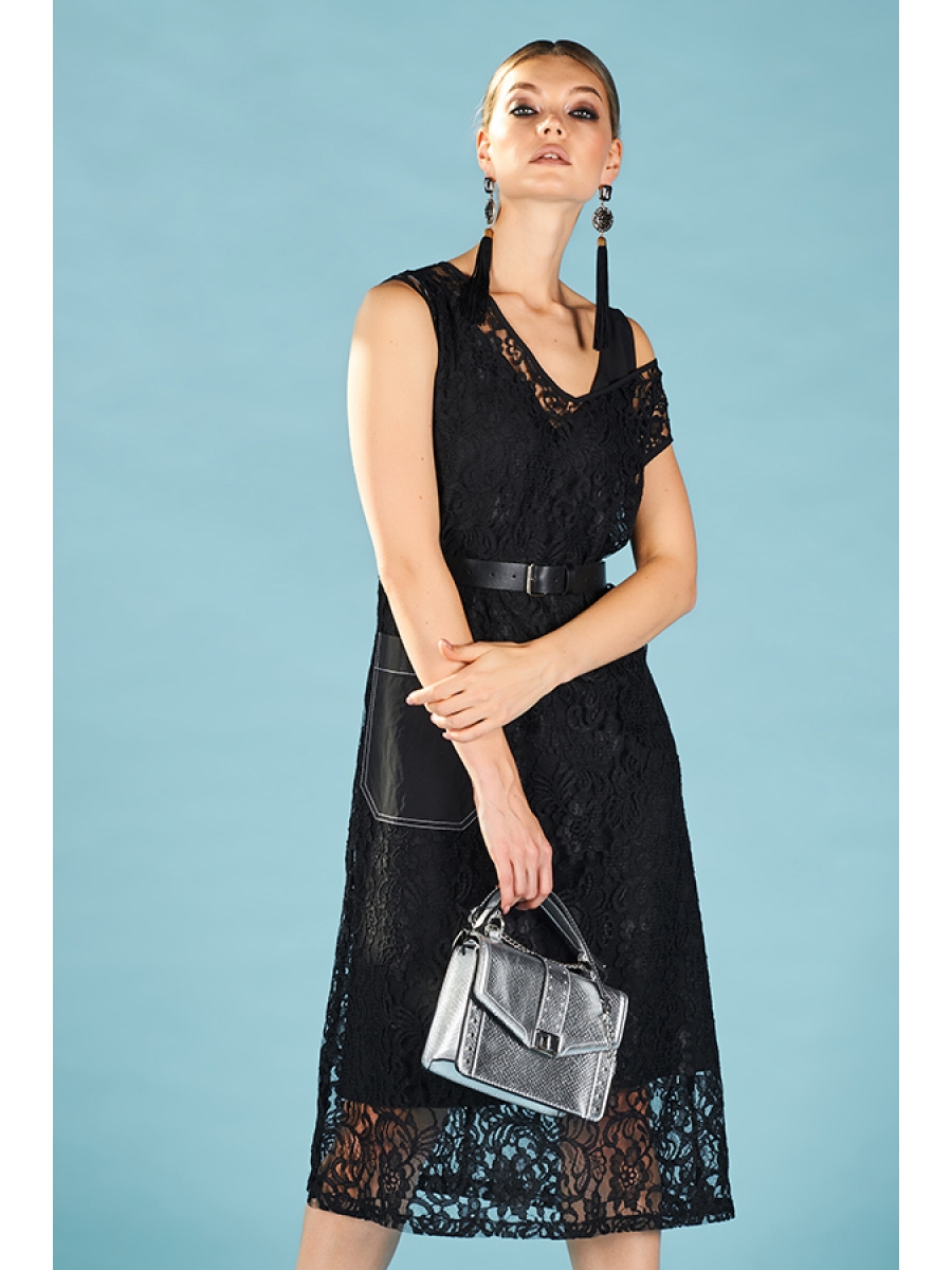 Двойное платье полуприлегающего силуэта, расширенное к низу, со спущенной линией плеча. Верхнее платье из кружевного полотна, нижнее-из легкой плательной ткани. V-образный вырез горловины и линия проймы оформлены косой бейкой. Стильный накладной карман с контрастной отстрочкой придаёт изделию современное звучание.