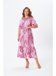 Платье А-образного силуэта выполнено из вискозной ткани с летним принтом. Платье с рубашечным воротником и центральной застежкой на петли и пуговиц. Перед с нагрудной вытачкой. Рукав втачной одношовный с притачной манжетой на петлю и пуговицу. По линии притачивания - сборка. По низу платья притачан волан со сборкой.