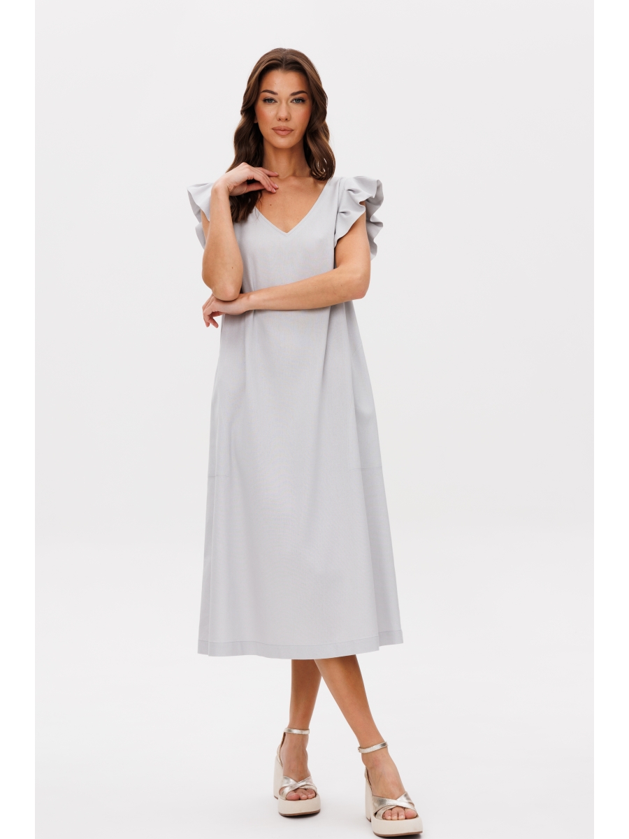 Свободный А-силуэт, изящный V-образный вырез, романтичное крылышко, комфортная длина миди. Полочка с нагрудной вытачкой и карманом в боковом шве. Спинка со средним швом, вырезом каре и эффектной завязкой, удерживающей линию горловины.