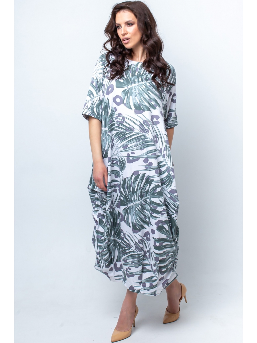 Платье женское трапециевидного силуэта, с карманами и складками в боковых швах. Горловина круглая, рукав втачной, короткий.