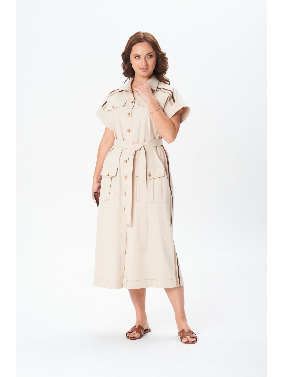Платье в стиле сафари А-образного силуэта из джинсовой хлопковой ткани. Застежка центральная на петли и пуговицы с отрезной планкой. Рукав спущенное плечо с манжетой с отворотом по краю. Кокетка по переду переходящая на спинку. Спереди настрочены карманы со складкой и клапанами в районе бёдер и клапаны в районе груди. Спинка со складкой от кокетки. По бокам и по краю кокетки сверху настрочена декоративная тесьма.