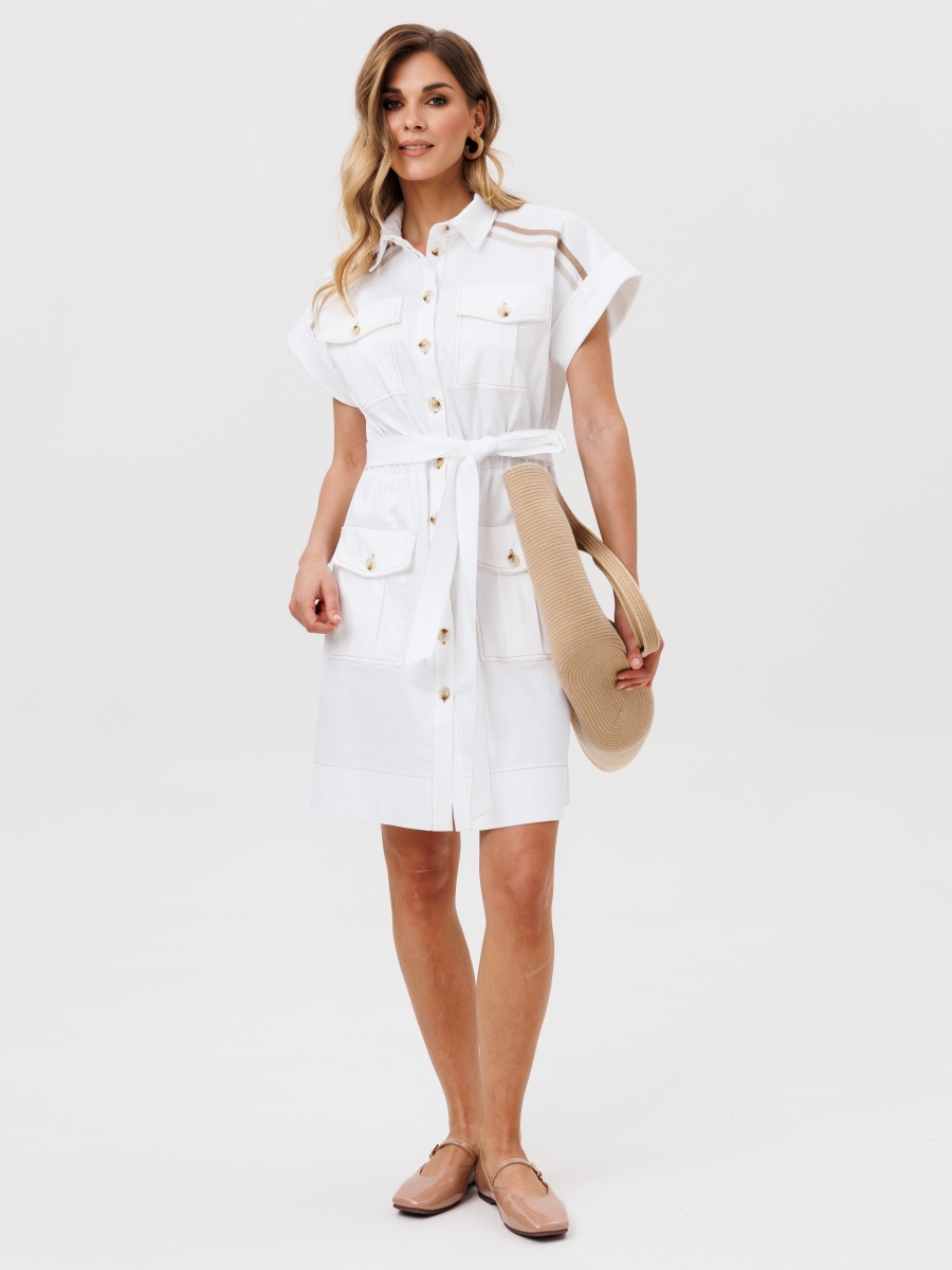 Платье в стиле сафари X-образного силуэта. Застежка центральная на петли и пуговицы с отрезной планкой. Рукав спущенное плечо с манжетой с отворотом по краю. Кокетка по переду переходящая на спинку. Спереди настрочены карманы со складкой и клапанами в районе груди и бёдер. По бокам и по краю кокетки сверху настрочена декоративная тесьма.