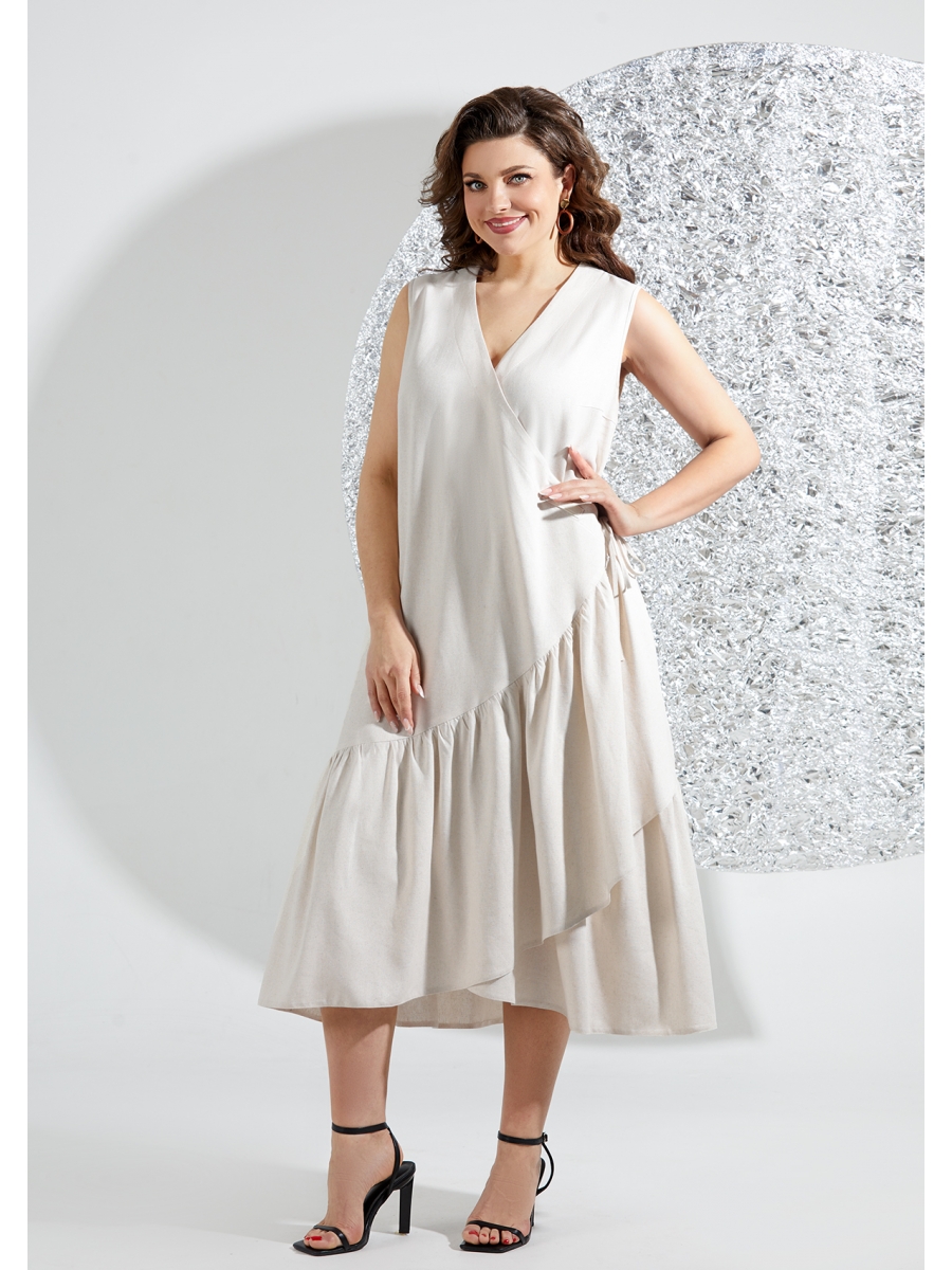 Летнее платье полу-прилегающего силуэта, выполнено из льняной ткани с добавлением вискозы. Перед платья выполнен двойной, с запахом и по нижней стороне с застежкой на петлю-пуговицу, по верхней стороне на завязки и декорировано по шву нашивкой. На полочке горловина V-образной формы, на обтачке, по низу платья притачной волан со сборкой. Спинка со средним швом и вытачками, по низу притачен волан со сборкой.