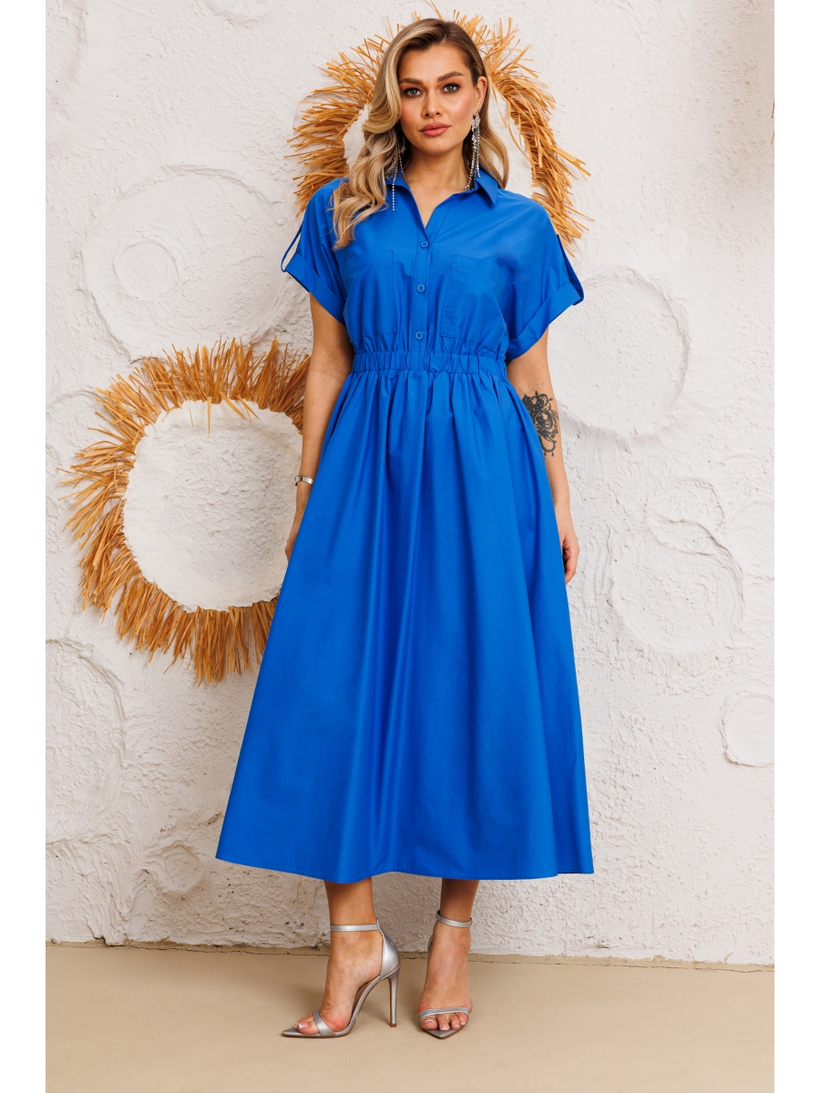 Элегантное и роскошное платье, выполнено из премиальной хлопковой ткани с добавлением вискозы. Верх платья с воротником стойкой, декорирован накладными карманами и планкой с застежкой на пуговицы, что придает модели особый шарм и нарядность. Платье отрезное по линии талии, на поясе с широкой резинкой. Рукав спущенный, с манжетой и патой с застежкой на пуговицу. Юбка платья расклешена, в боковых швах функциональные карманы. Платье эффектное, с идеальной посадкой, идеальный вариант для торжественного мероприятия и на каждый день.