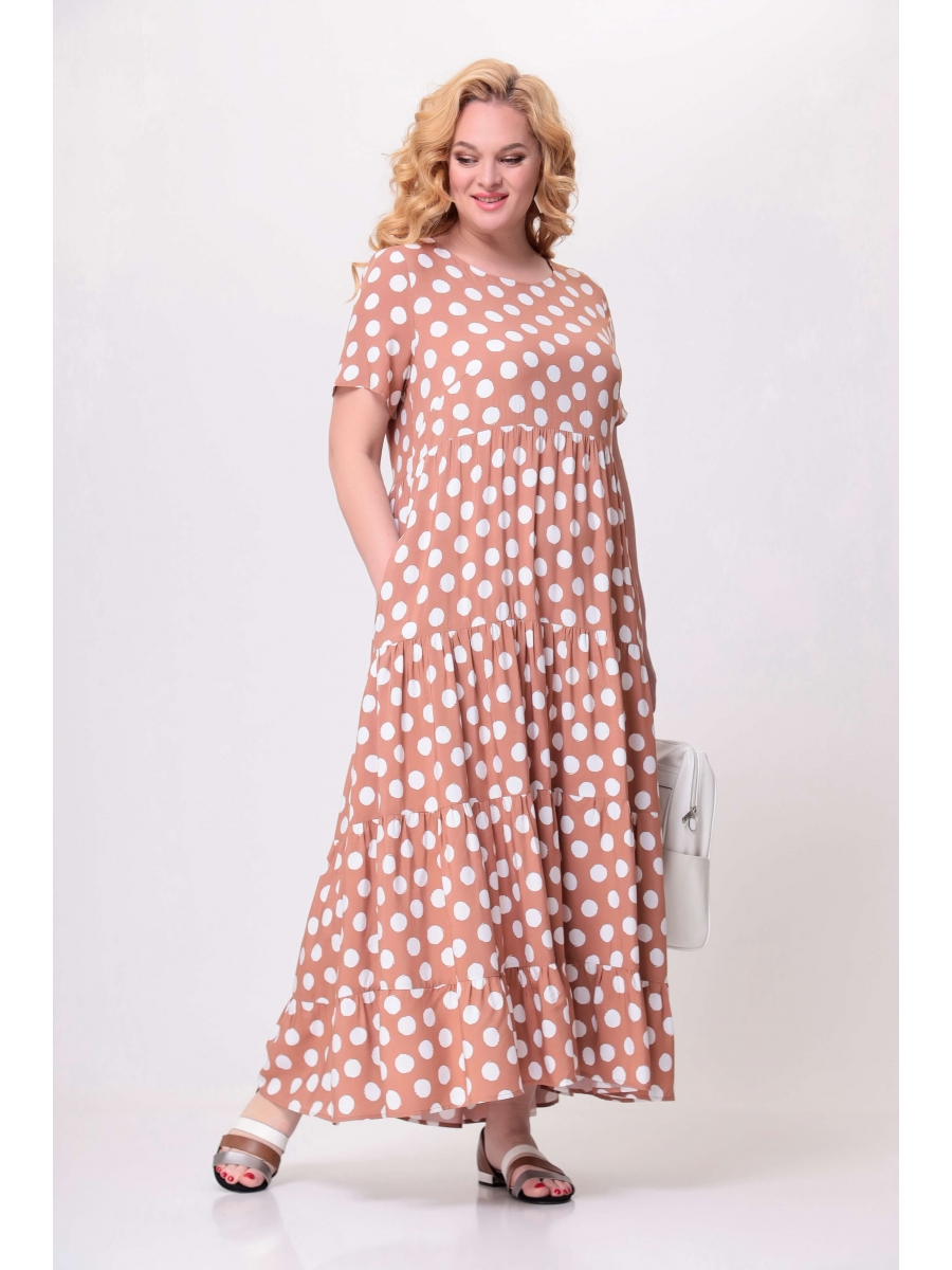 Платье полуприлегающего силуэта, длиной maxi. Выполнено из вискозной ткани. Платье с отрезной, слегка завышенной линией талии. По переду лифа расположены нагрудные вытачки. Рукав втачной короткий. Горловина округлой формы. По низу платья - 4 волана, собранные на сборку. В боковых швах платья расположены карманы.