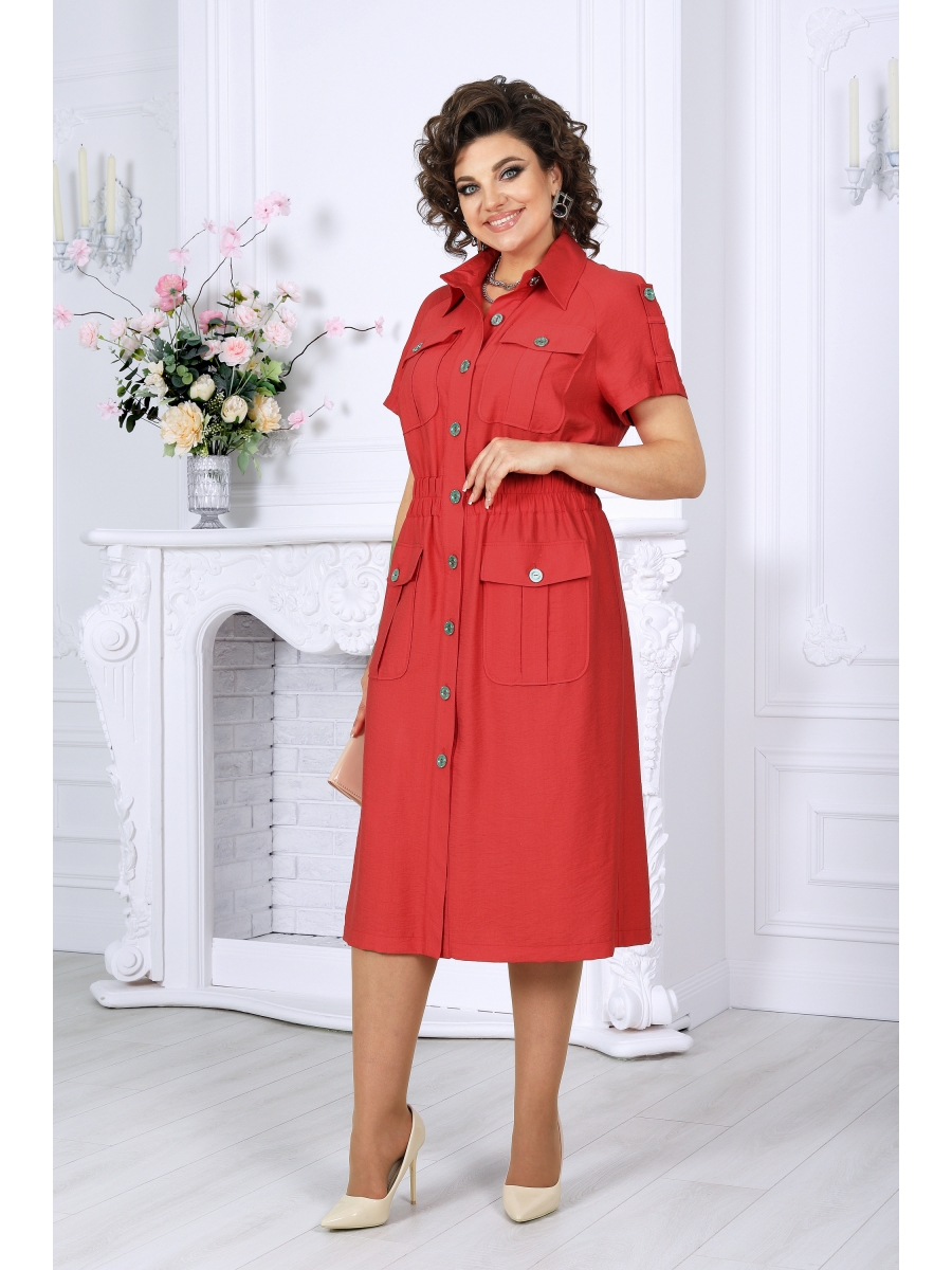 Платье женское приталенного силуэта, выполнено из вискозного полотна. Модель без подкладки, без плечевых накладок. По линии талии спинки и переда -- отрезной пояс с широкой эластичной лентой внутри; по середине пояса прострочена отделочная строчка. Перед с внешней застежкой на 8 петель и 8 пуговиц; по линии талии – дополнительная внутренняя застежка на 1 пуговицу. В верхней и нижней части переда настрочены фигурные накладные карманы с бантовой складкой посередине и клапаны, застегивающиеся на 1 петлю и 1 пуговицу. Горловина оформлена отложным воротником на отрезной стойке. Рукав короткий, реглан; дополнен патой, зафиксированной на плечевом шве двумя шлевками и пуговицей. Длина платья – 110 см; длина рукава (от горловины) – 32 см.