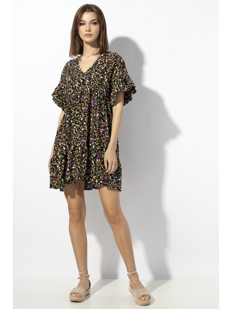 Оформить заказ →Платье женское повседневное из штапельного полотна, свободного силуэта. Горловина V-образной формы. Передняя и задняя часть двумя отрезами и мелкой сборкой по всему изделию. Плечо спущенное. Рукав цельнокроеный, короткий, с оборкой по низу.