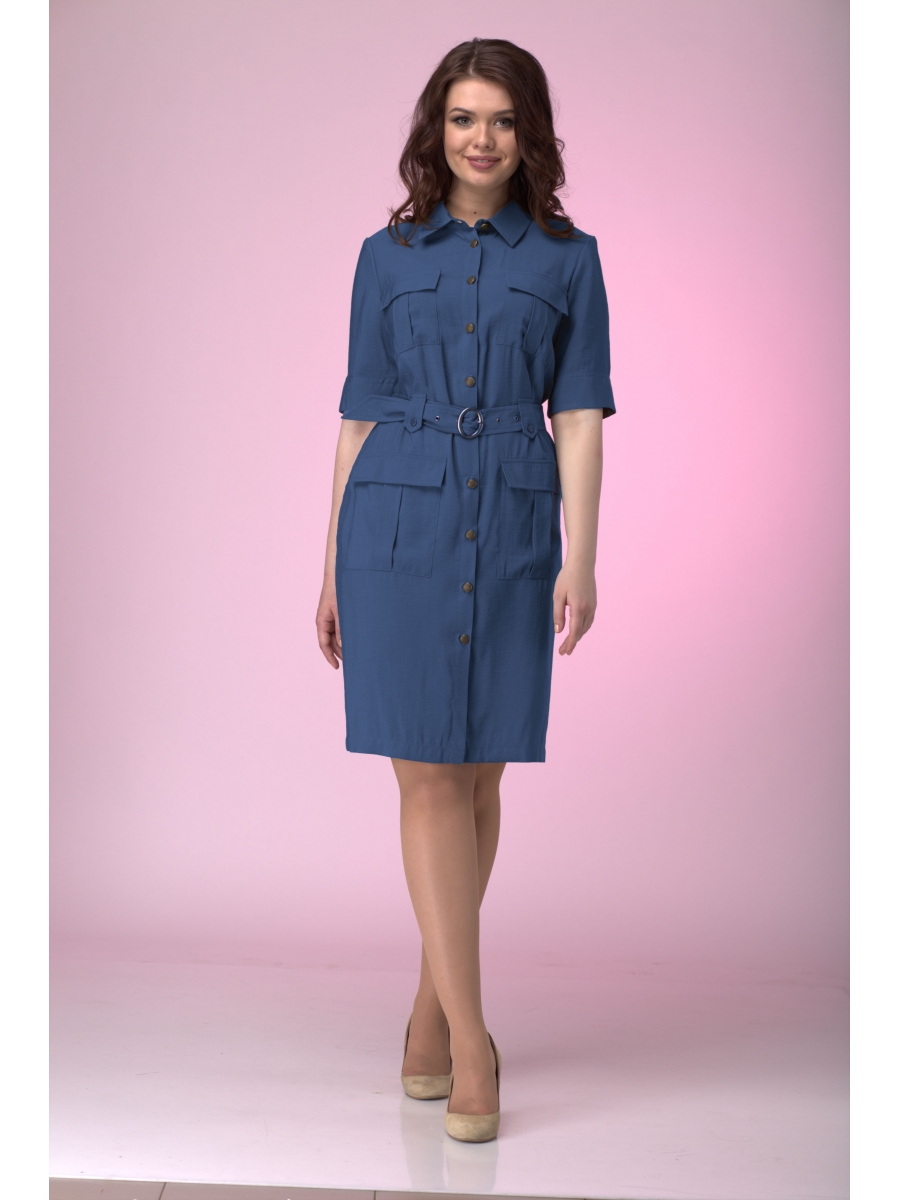 Прямого силуэта с нагрудными карманами, по переду центрального шва застежка на пуговицы, с нагрудными вытачками. Спинка со средним швом и талевыми вытачками. Модель с подчёркивающим фигуру кроем. Накладные карманы. Комплектуется поясом в тон платья.