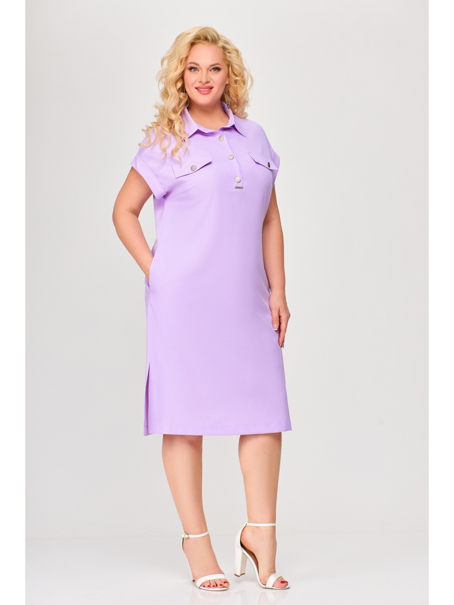 Платье из мягкой вискозно-льняной ткани полуприлегающего силуэта. По переду обработаны нагрудные вытачки и планка до линии груди, застёгивающаяся на 4 петли и 4 декоративные металлические пуговицы. По переду платья расположены два нагрудных клапана с пуговицами. Воротник рубашечный с отрезной стойкой. Рукав цельнокроеный, короткий, спущенный с отложной манжетой по низу. В комплекте пояс из основной ткани.