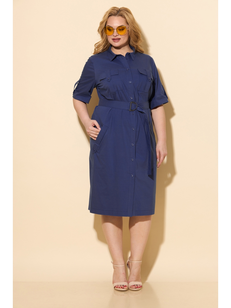 Платье в стиле сафари, полуприлегающего силуэта. По переду центральная застежка с планкой на петли-пуговицы, прорезные карманы с втачной листочкой и декоративным хлястиком. Воротник отложной на стойке. Спинка со средним швом и отрезной кокеткой в верхней части. Рукав втачной, одношовный, с отложной манжетой и декоративным хлястиком. В комплект входит пояс из текстильной ткани.
