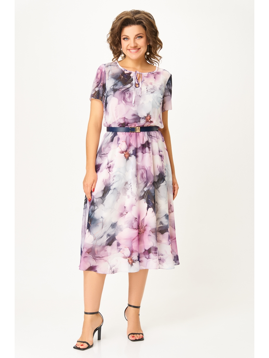 Платье из мягкой шифоновой ткани, на трикотажной подкладке, отрезное по линии талии, шов собран на эластичную тесьму-резинку. Горловина округлой формы, по переду капелька с завязкой. Рукав втачной, короткий. Юбка расклешённая. Подкладка лифа платья на бретелях.