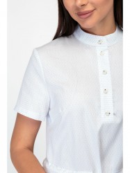 На передних частях обработаны нагрудные вытачки, застёжка планка на петли и пуговицы.