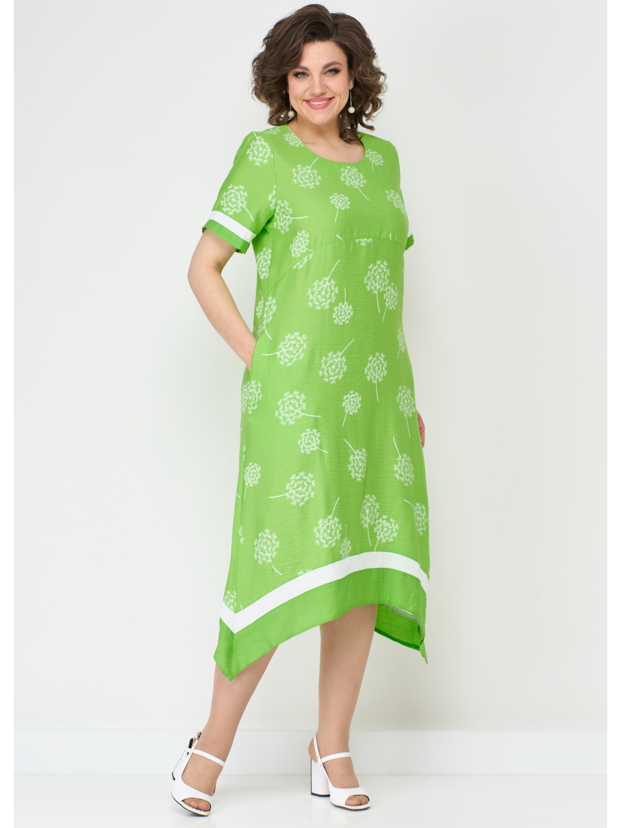 Платье женское свободного кроя, расширенное к низу. По низу изделия и по рукавам притачная декоративная деталь состоящая из двух цветов. Горловина круглая, по боковому шву -карманы. Рукав втачной, выше локтя. По полочке фигурный подрез по линии груди. По спинке притачная кокетка и средний шов. Низ изделия короче по центру и длиннее по бокам. Рекомендуется для женщин молодого и среднего возраста для повседневной и праздничной носки. Хорошо смотрится с кроссовками, а так же с туфлями на каблуках.