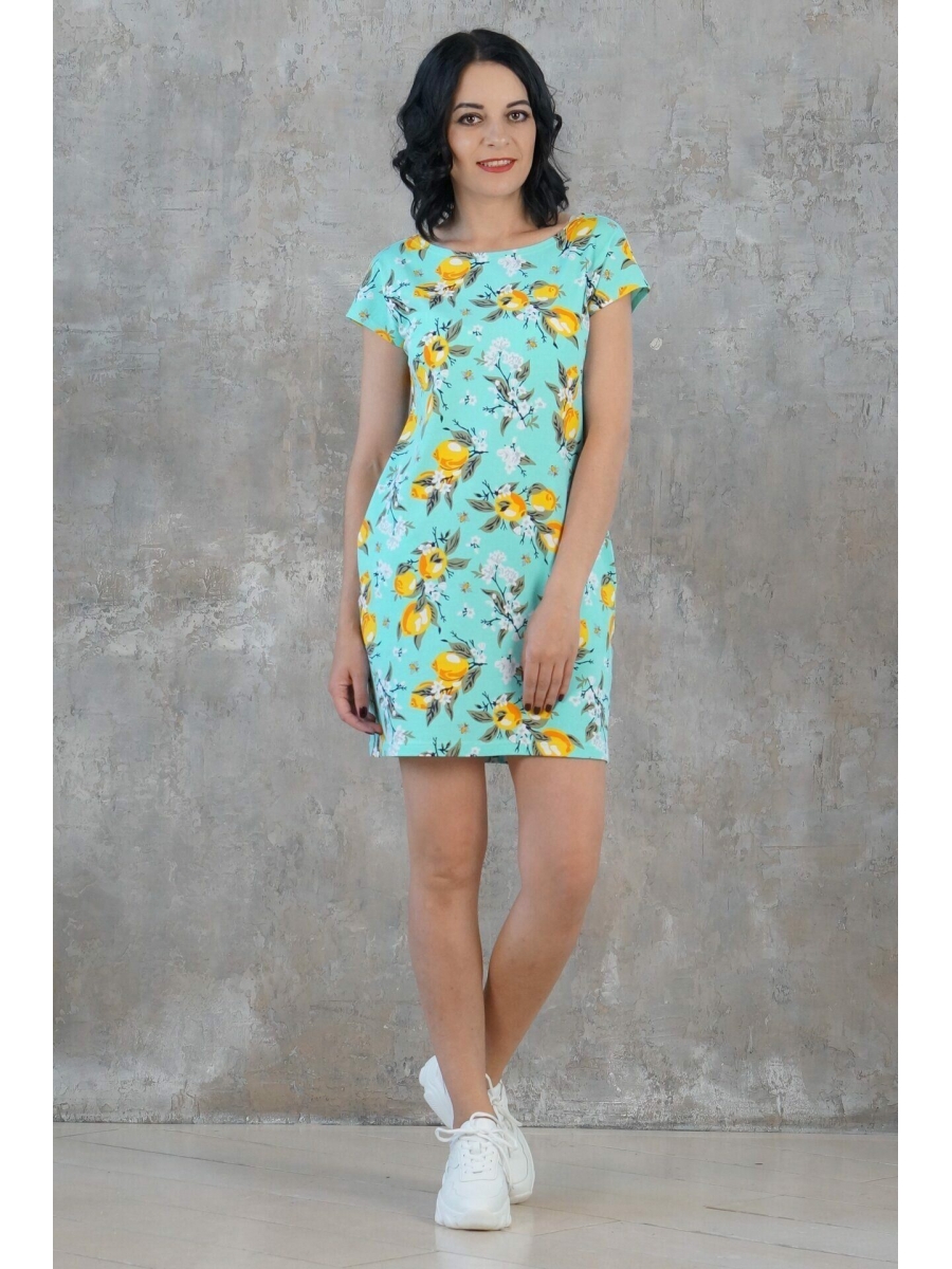 Платье из вискозного эластичного трикотажного полотна свободного силуэта. Расцветка лимоны на голубом. Круглый вырез горловины. Короткие рукава. По спинке V- образный вырез декорирован лямками.