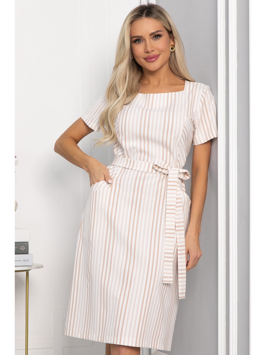 Платье в полоску — стильное и оригинальное решение в гардеробе каждой женщины. Пояс из основной ткани, который входит в комплект, поможет акцентировать внимание на талии. Такое платье прекрасно дополнит ваш базовый гардероб. Вырез горловины — каре, красиво подчеркнет ключицы. Рукав втачной, короткий. Принт «полоска» визуально вытянет фигуру и сделает стройнее.