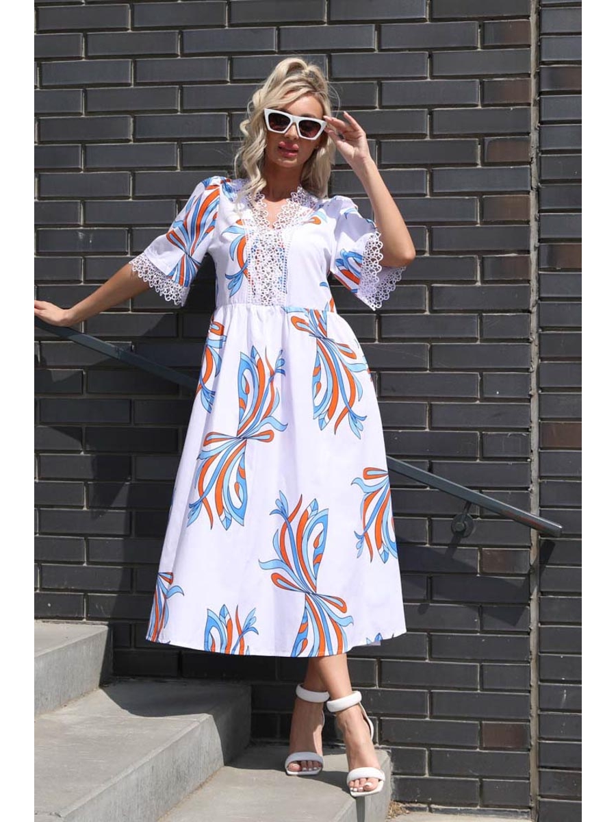 Очаровательное платье полуприлегающего силуэта из текстильной ткани белого цвета. V-образный вырез и верхняя часть переда дополнены кружевом. Втачные рукава обработаны манжетами и дополнены кружевом. Платье отрезное, линия талии завышена и подчеркнута сборкой. Длина изделия по спинке от плечевого шва до низа изделия — см.