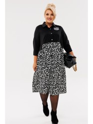 Платье женское из 2-х видов блузочной ткани (однотон и горох) прямого силуэта. По полочке идет фигурный подрез под грудью, переходящий в фигурный подрез по спинке. По юбке по подрезу идет сборка и клапаны. Благодаря чему любая фигура будет выглядеть стройнее. По полочке идут грудовые выточки из проймы. Застежка - планка на петли и пуговицы. Воротник с отрезной стойкой. По спинке - отрезная кокетка. Рукав 3/4 длины на манжете.