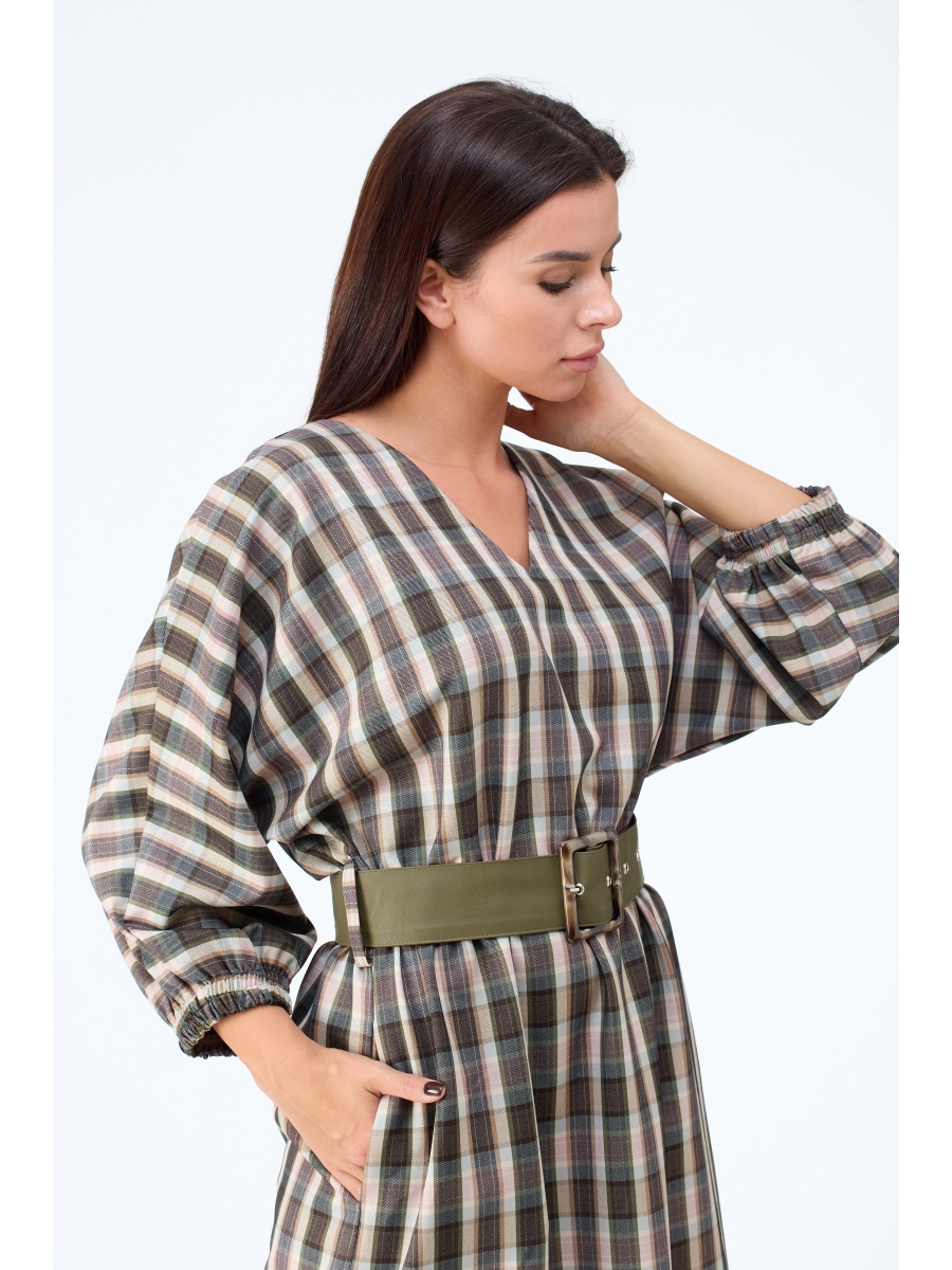 Платье из ткани с принтом «в клетку» красивых осенних оттенков. Свободный силуэт, в области линии талии вставлена эластичная лента. Цельнокроеные рукава, низ которых собран на резинке. Элегантный v-образный вырез горловины. В боковых швах выполнены разрезы. Дополнено съёмным ремнём из экокожи.