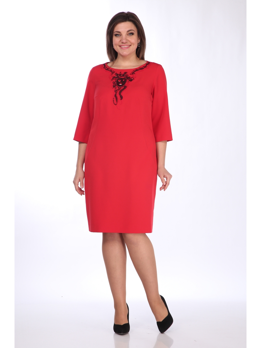 Платье женское, полуприлегающего силуэта. С круглым вырезом горловины. Перед с нагрудными вытачками и вытачками от боковых швов, а также декоративной вышивкой. Спинка со средним швом, с потайной застежкой - "молнией", по низу со шлицей, с талиевыми вытачками и вытачками от горловины. Рукава втачные, одношовные, длиной 3/4.